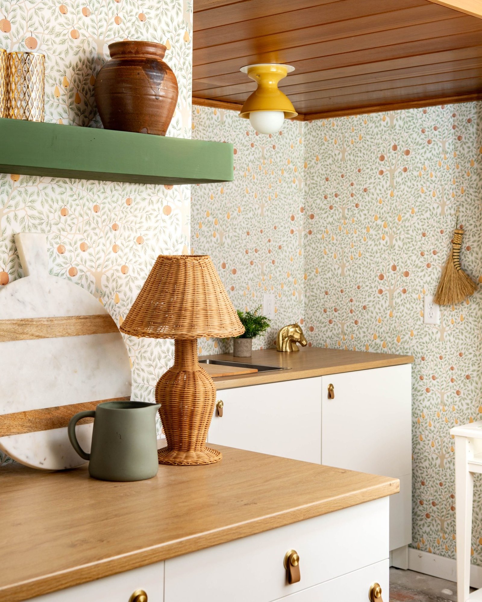 The kitchenette was my chance to add some color in a basement that we had removed so much texture from. After we painted the brick and removed the cream color from the walls, I didn’t want this space to feel like an afterthought. I wanted it to have its own personality. The Galerie Pomona wallpaper gave me that. It’s lush and a little dramatic, but doesn’t compete with the bold terracotta tile.